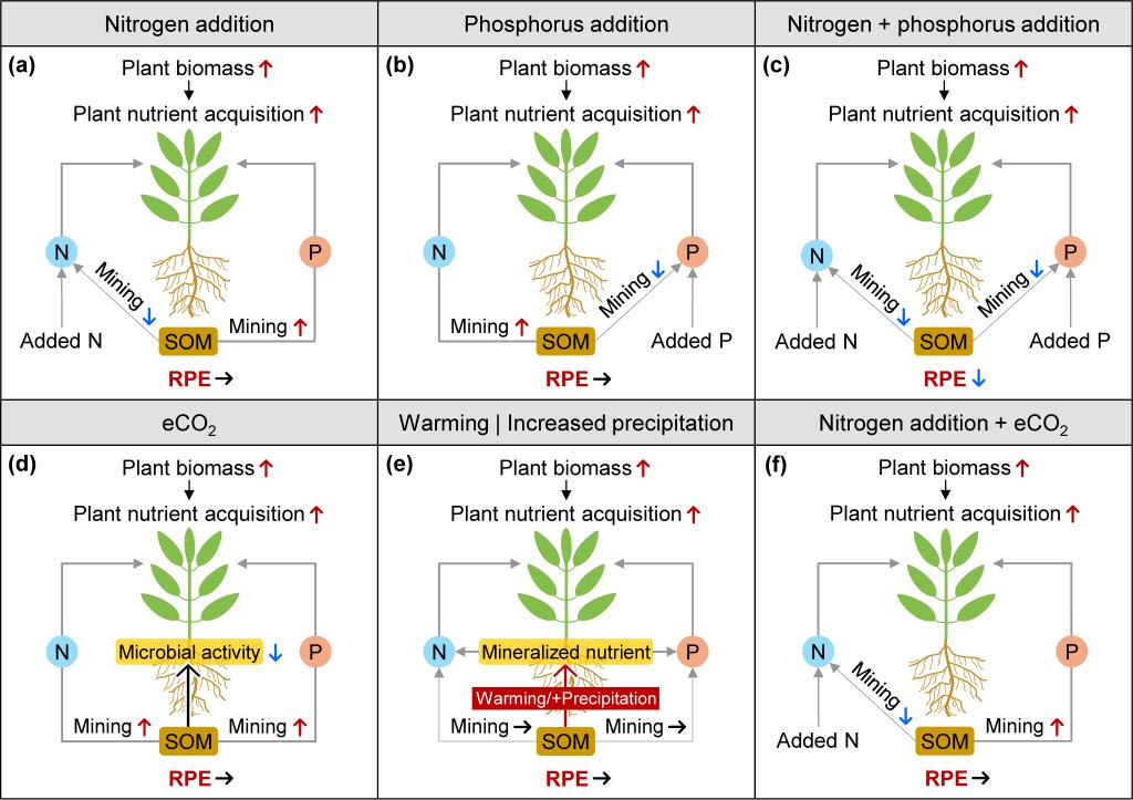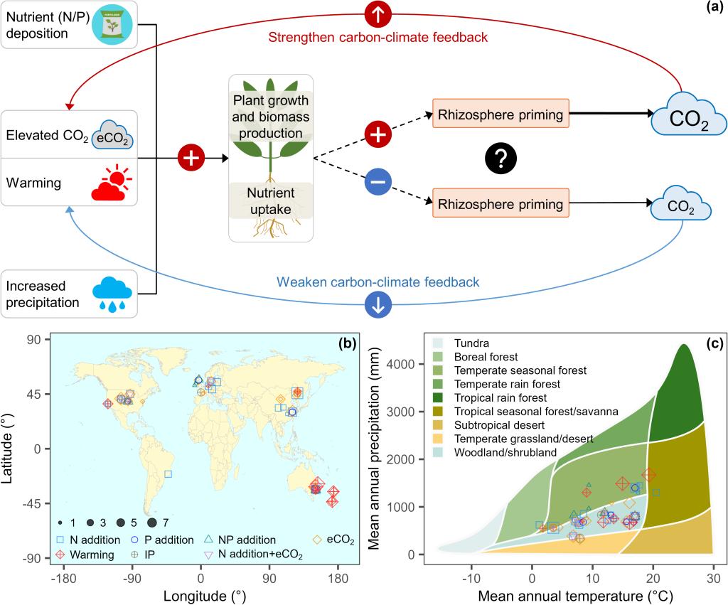根际激发效应(RPE)是指植物活体根系对土壤有机质分解的影响,其产生是植物根系、土壤微生物和土壤有机质之间相互作用的结果,主要由根系分泌物驱动,通过改变微生物生物量及其活性等来实现,同时受其他生物与非生物因子调控。RPE是植物和微生物获取养分的主要途径之一,能够加速养分释放,促进生态系统养分循环;而且将其纳入模型能够提高模型对全球土壤有机碳储量及碳密度分布的估测精度。RPE能使土壤有机质分解平均增加40–60%,在陆地生态系统碳和养分循环以及维持生态系统功能中具有重要作用。然而,全球变化如何影响RPE仍不清楚。这极大地限制了我们对未来全球变化情景下RPE变化的认识,以及对碳-气候反馈和未来土壤碳动态的预测。