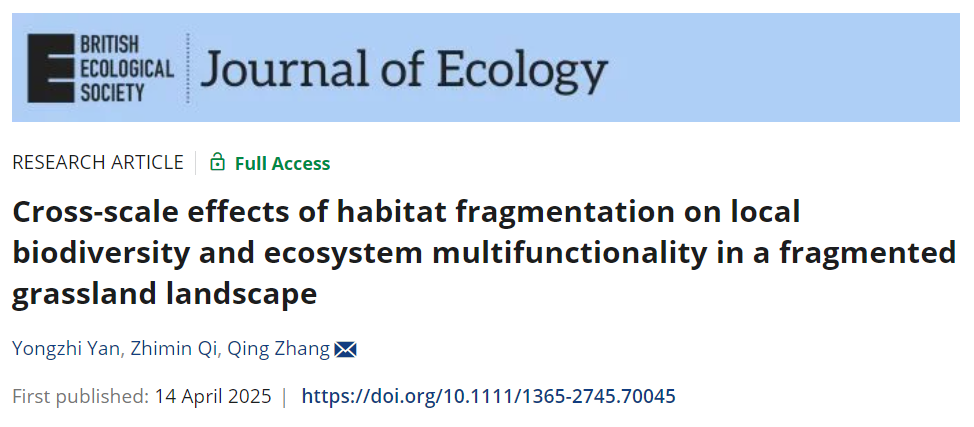 近日,蒙古高原生态学与资源利用教育部重点实验室成员、内蒙古大学生态与环境学院张庆教授团队在生境破碎化对草地生物多样性和生态系统功能影响方面取得了最新进展。研究成果以“Cross-scale effects of habitat fragmentation on local biodiversity and ecosystem multifunctionality in a fragmented grassland landscape”为题发表于生态学经典学术期刊《Journal of Ecology》。
